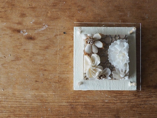 冬の朝にひっそりと花開いた「白」 手塗りの漆喰に重なるのは、幾重ものフリルを纏ったソラフラワー。 花と花の間のシルバーの環は、 凍てつく空気の中で零れ落ちた、光の雫を思わせます。 柔らかな花びらの呼吸と、硬質な銀の残響。小さな世界に、清らかな旋律が聞こえるような、空間を白銀に染める作品です。 サイズ 直径10センチ 厚み約4.7センチ 表面にのみアクリル板が付いています。 壁に掛けられる金具が付いています。 ❁お願い❁ できるだけ近い色味で掲載を心がけていますが、モニター上と実物の色味が違ってしまうこともございます。ご了承の上、お買い上げくださいますようお願い申し上げます。 ソラフラワーやプリザーブド加工された苔を使用しております。 (ソラフラワーとは東南アジアの植物「ソラ」の茎を使って作られたものです。) これらは直射日光を浴び続けたり、水に濡れたり、湿気の多い所などでは色の変化が起こりやすくなります。 上記の状態を避けて飾ってくださいましたら、色の変化も少なく長く楽しんで頂けます。 ❁お手入れ方法❁ ホコリはエアーなどを使って優しく飛ばしてください。 アクリルはホコリ取りや、メガネクリーナーなどで拭いて頂くと綺麗になります。